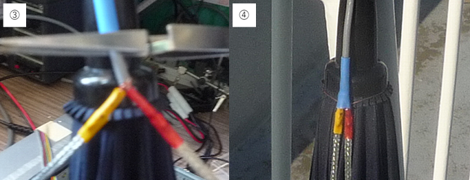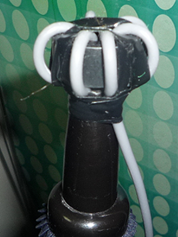 C同軸ケーブルとエレメントの接続点をエナメル銅線で傘の先端部分に固定します。 |