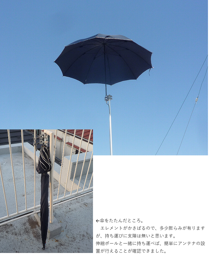 骨は10本で親骨と主軸はグラスファイバー製という、アンテナにはうってつけの傘でした。 |